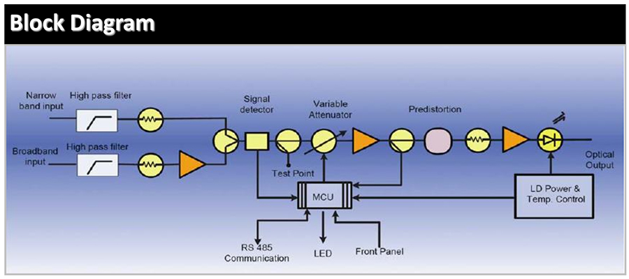 The GSDT-FTX-II-1550 forward transmitters are part of a new series in the Excelsior optical transmission platform that will mix with other GSDT-FTX series to integrate into the same GSDT-link Chassis. The module contains a high performance, advanced pre-distortion circuitry achieves superior CSO and CTB, and ideal for broadcast and narrowcast applications. It can provide a wide range of optical output power to deliver both analog and digital signals. All configuration parameters of modules can be monitored by LED screens on the front panel of the module, or by the GSDT-EMS equipment management module.